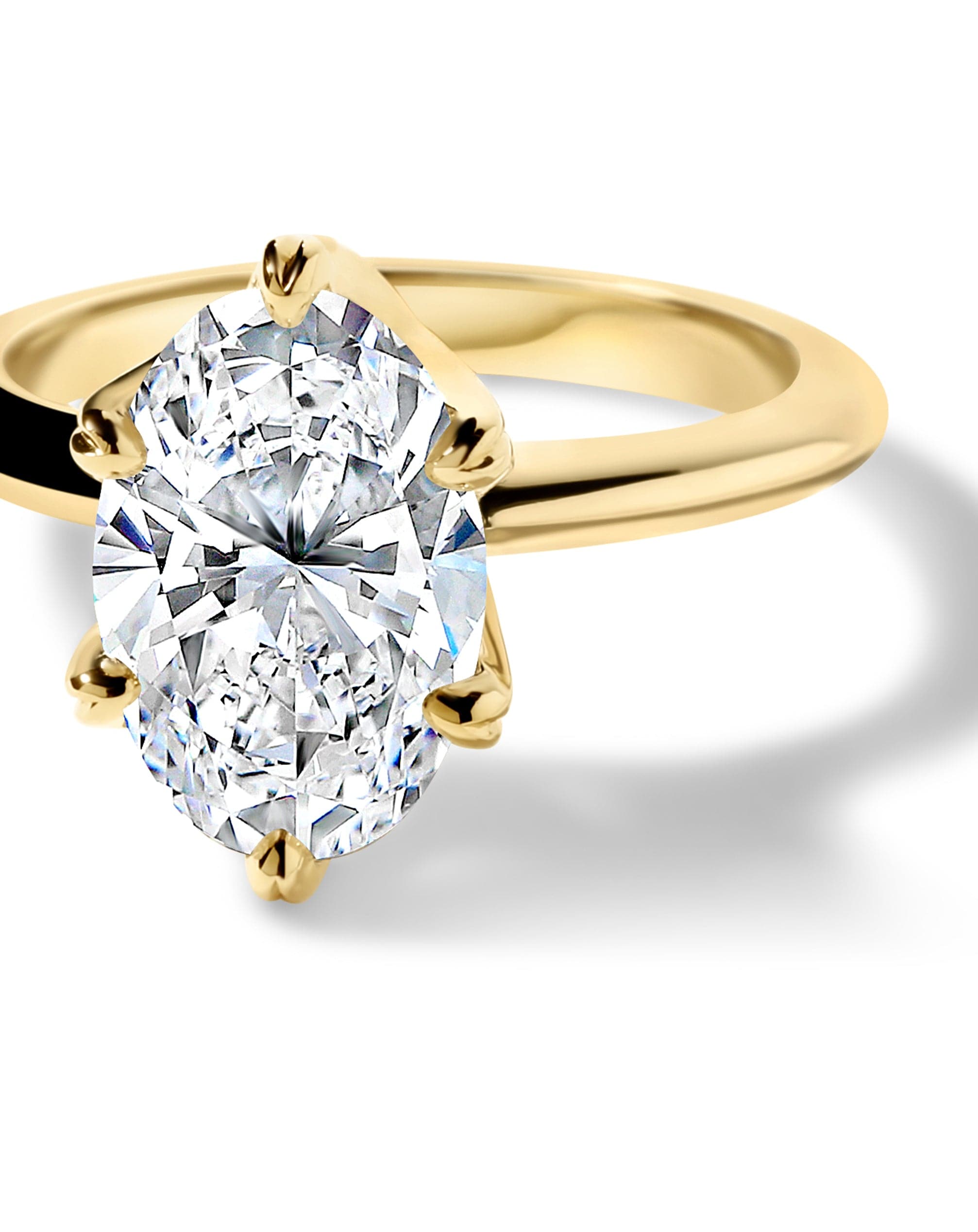 The intricate basket features six delicate heart-shaped claws accentuating the elegant elongated form of the oval diamond or gemstone at its centre.