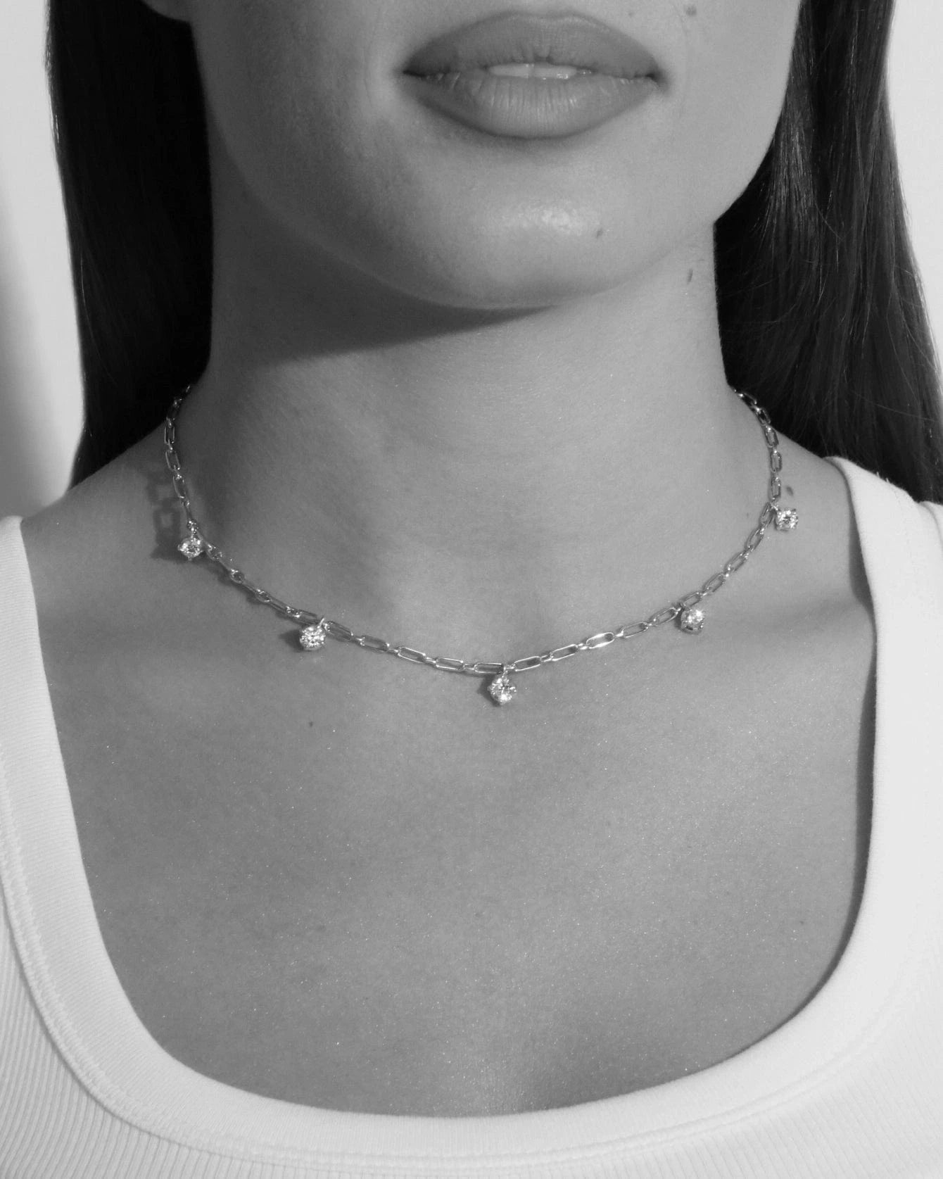 This necklace features five graduating diamonds settings along a paperclip chain. Designed to sit high along the collarbone for the best presence and brilliance from the diamonds. This necklace has an approximate TDW of 1.65ct diamonds.