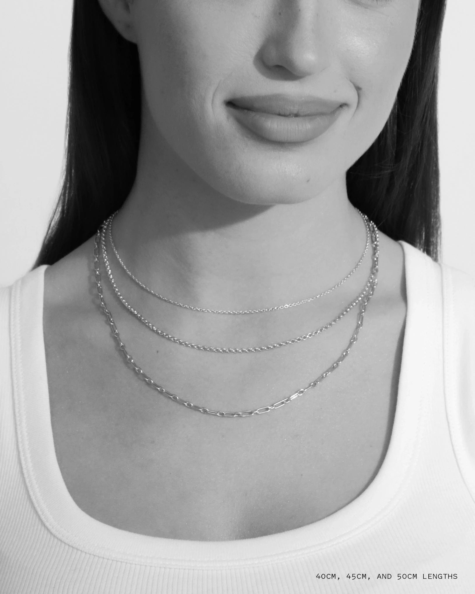 Crafted in 40, 45 and 50 cm lengths, our classic paper clip chains are designed for every day. Ideal for layering with pendants, they carry a simple elegance when worn alone.