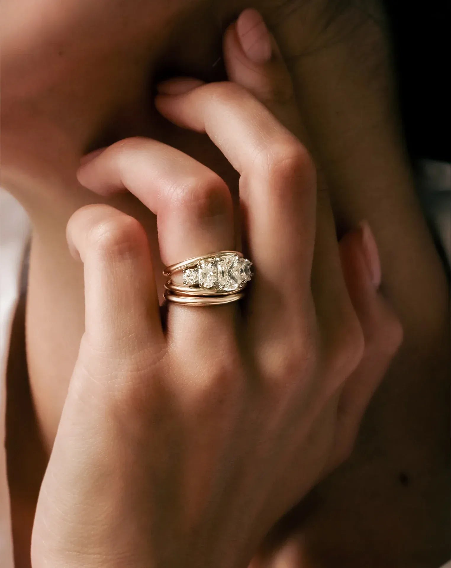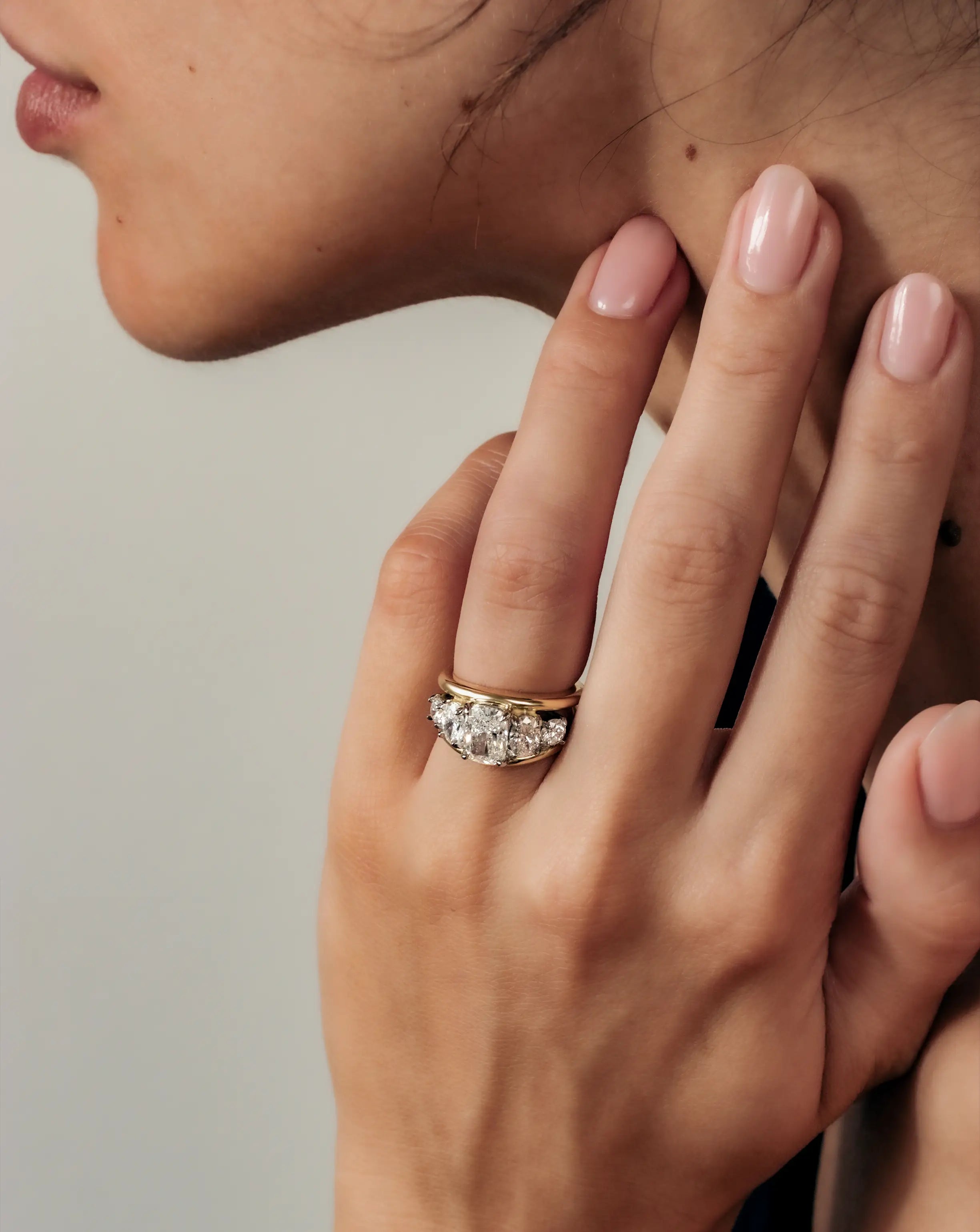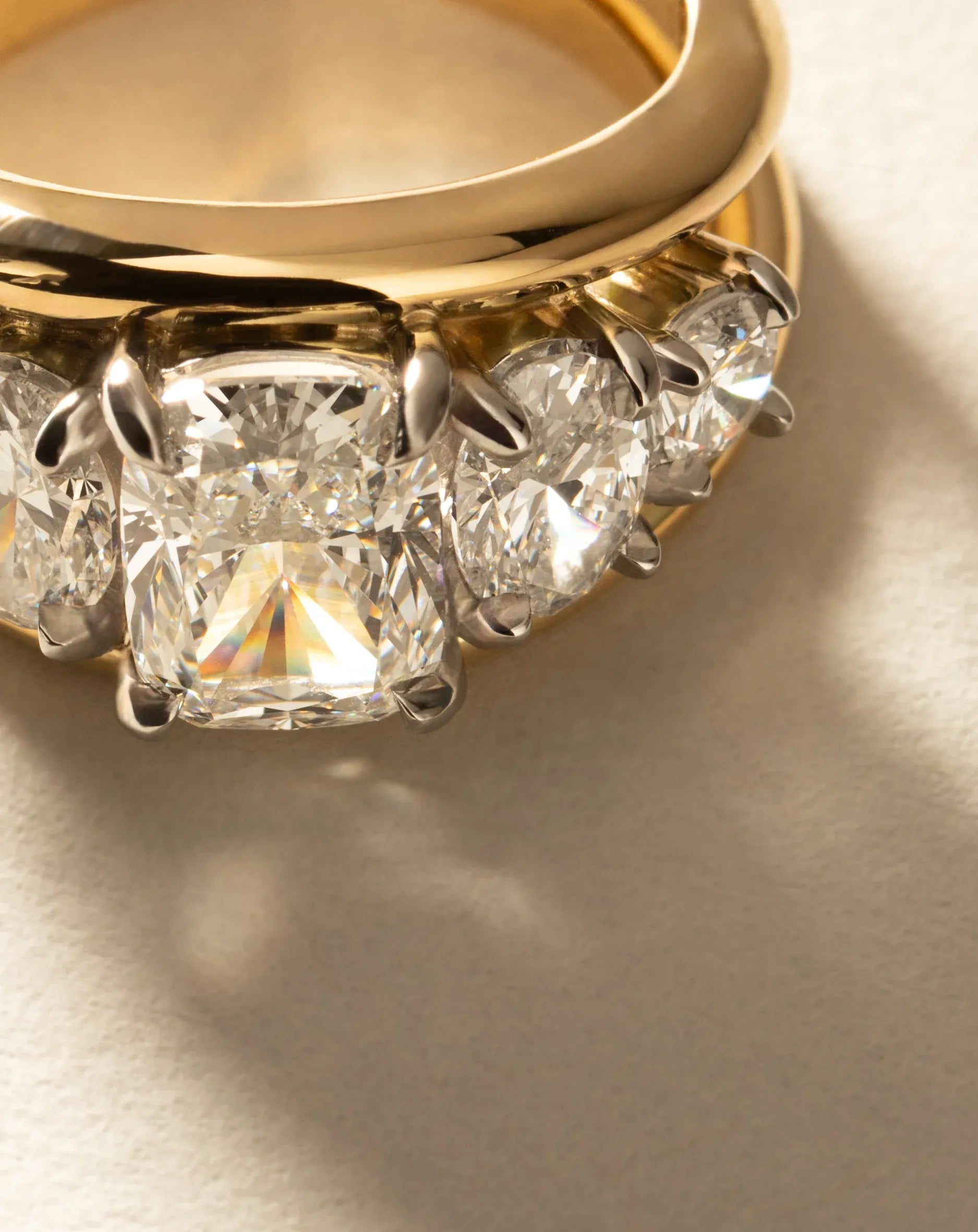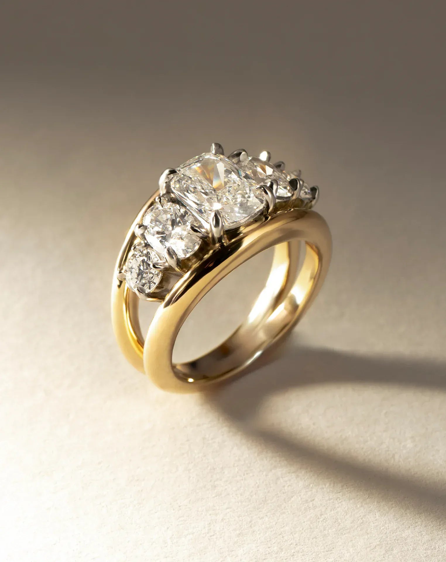 At its heart lies a striking elongated cushion-cut centre stone, accompanied by oval and round brilliant accents, each set with elegant pear-shaped claws. This diamond array elegantly floats between two sculpted bands, formed with a soft high arch to gently frame and support the setting.