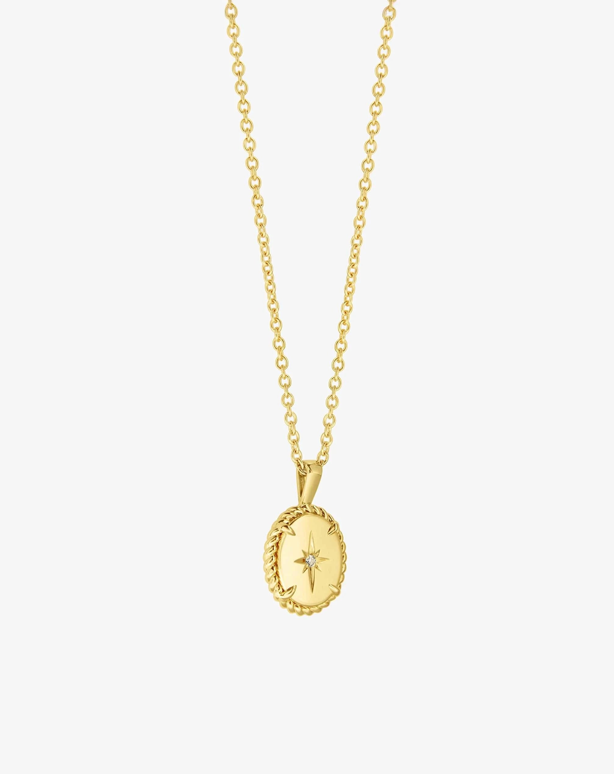 Our iconic Knots motif wraps around an oval gold medallion showcasing a hand engraved star with a delicate diamond at the heart.