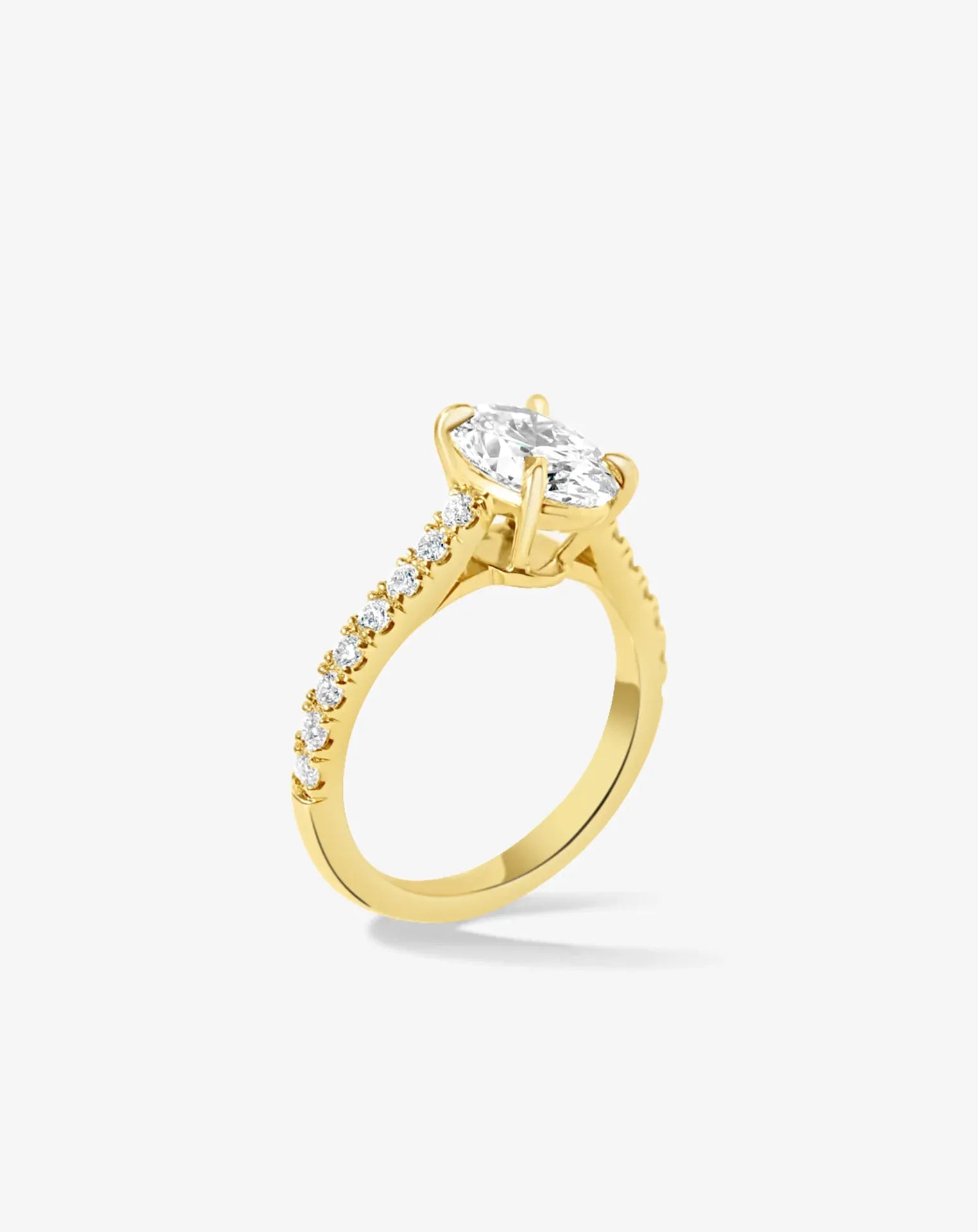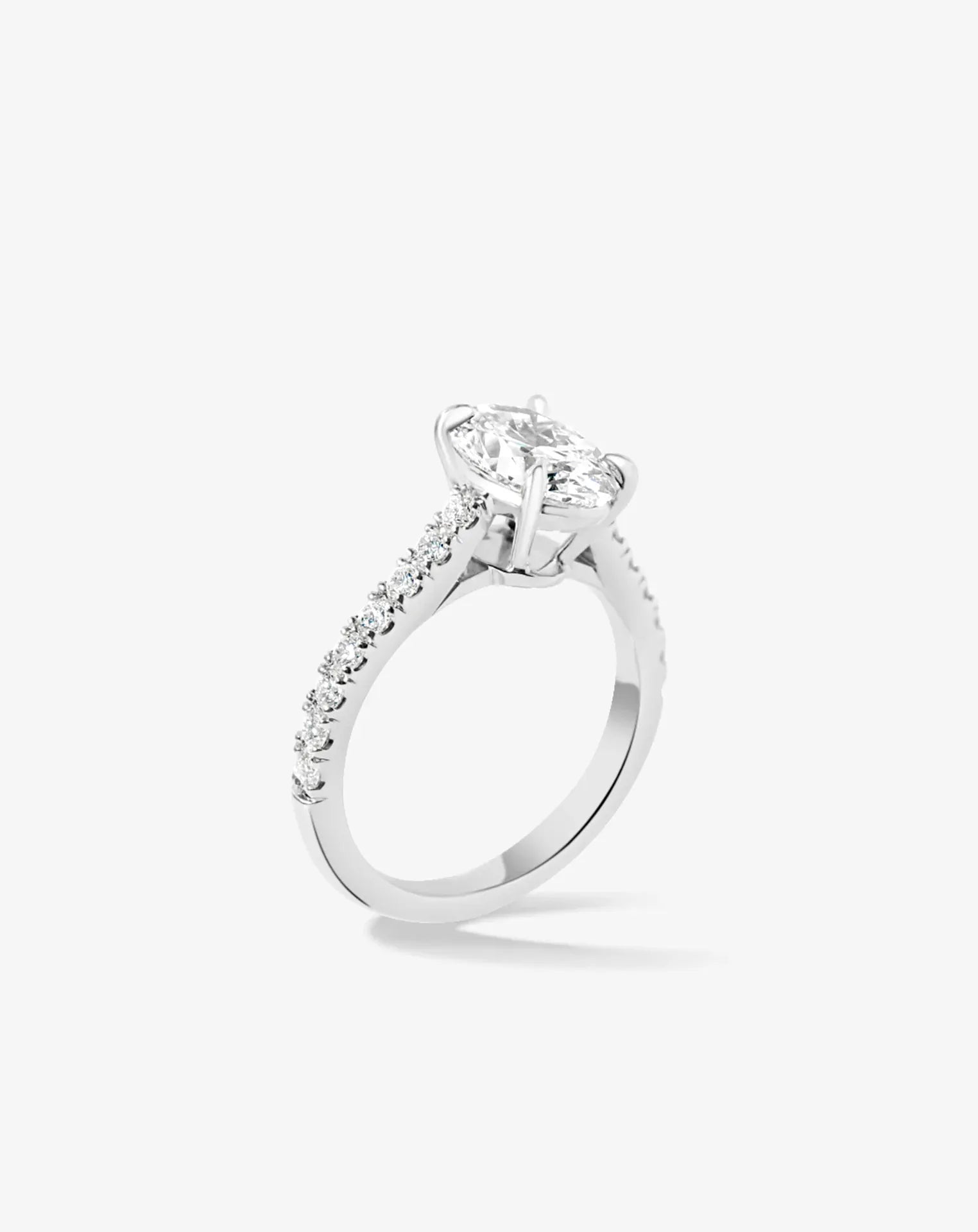 The Apollo - Oval Setting is a collection favourite, defined by its classic, sculptural form and refined detailing. An oval-cut diamond is held by four pear-shaped claws in a tapered basket, while a diamond-set band sweeps softly toward the centre, allowing light to pass through each scallop-set stone for exceptional brilliance. Timeless with unmistakable sparkle.