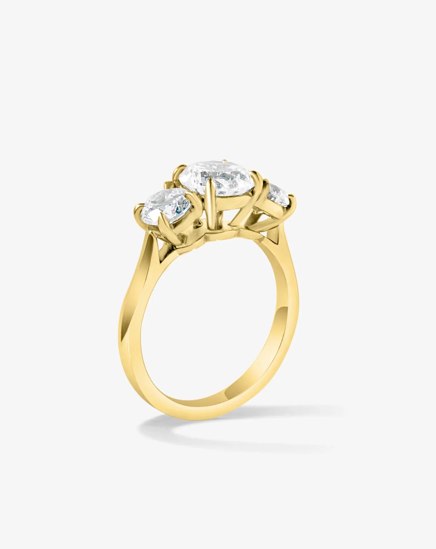 The Avior Setting is a modern interpretation of the classic three-stone ring, defined by a sleek silhouette and elegant presence across the finger. Round brilliant diamonds are secured by four claws in each setting, creating a soft cushion feel while maximising brilliance. Bold yet refined, the Avior is designed for those drawn to confident proportions and timeless appeal.